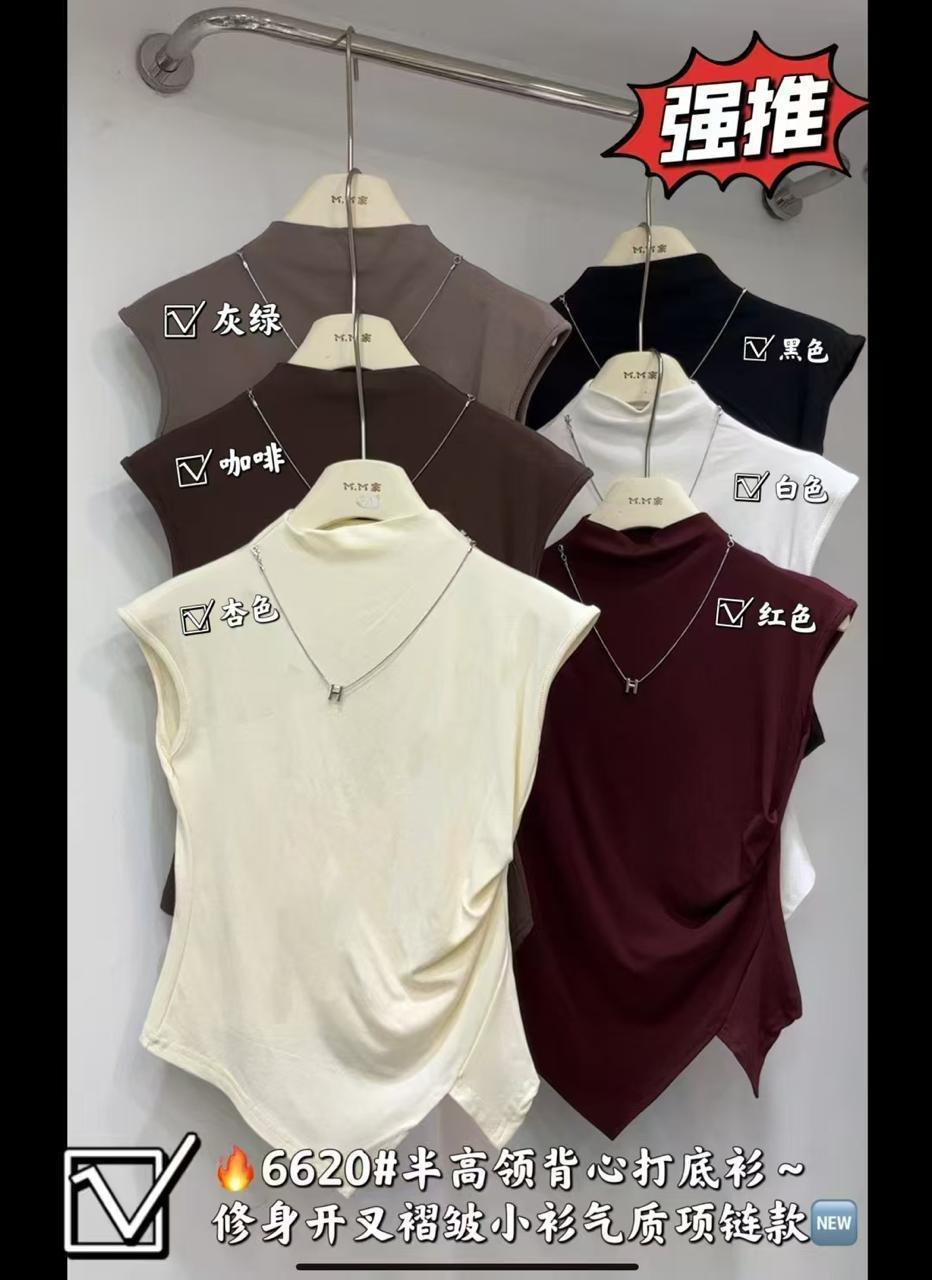 Elevate your basics with this premium sleeveless high-neck top, designed with a flattering draped hem and slim-fit cut. Style 6620# is a versatile wardrobe essential—perfect for layering or wearing solo for a sleek and polished look. Comes in a beautiful range of neutral and deep shades to suit every mood and occasion. Finished with a minimal yet stylish chain accessory detail for added elegance.